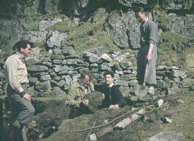 This photo shows the dig to open County Pot (1952), The survey from Slaughterhouse Sink, which was the entrance at the time, showed a passage ending under the Gill. The dig was started here. Both RRCPC & NPC were Lancashire clubs we wanted the entrance to be in that County, The actual boundary is the wall,which fell into the hole so we finally ended up against the cliff where it is today. From the left George Petersen NPC, Dr. Jack Aspin NPC, Wilf Taylor RRCPC, Jack Myers NPC. |