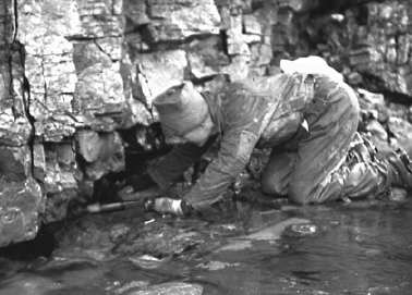 Dr Aspin putting flouresceine & drain testing cartridge in Slit Sink (Early 1950's). This lead to the naming of Green & Smelly Passage. at the bottom of Pool Sink |