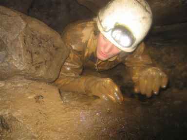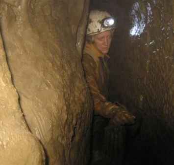 ![]() Ruth McDonald in gritstone boulder squeeze. Concrete has now been added to stailise this area, |