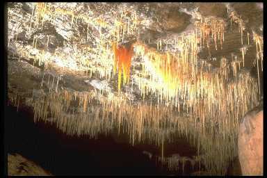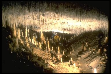 A climb up here to the right leads into the start of the GYPSUM CAVERNS, and it is possible to make a complete loop around in them to ASSEMBLY HALL via EASTER GROTTO. A further loop runs beneath GYPSUM CAVERNS starting near the climb, a sandy bedding plane leads to a chamber and a tight tube connects with the main streamway near the climb up to EASTER GROTTO in ASSEMBLY HALL.