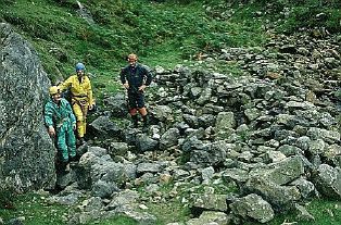 right bank of Aygill surrounded by a dam of boulders. Climb down the