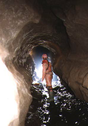 Downstream an easy crawl emerges in MIDDLE CHAMBER with a steep choke to the left and the roof quickly lowers to the WET CRAWL which has a low airspace for 18m (liable to flooding). A fine tunnel continues to the impressive terminal sump. The stream reappears in THE BULL POT of WITCHES but no physical connection has yet been made.