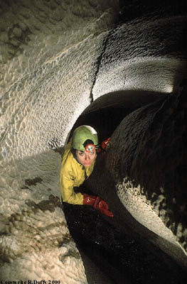 Downstream from Dismal Junction a crawl ends at a squeeze past some massive blocks where the stream backs up in flood. Holes between the blocks lead up some slippery climbs into the high level cavern of MOLLUSCAN HALL