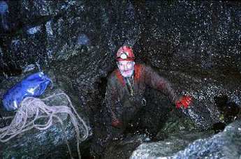 out crawl to a narrow pitch head. Just before this by climbing down